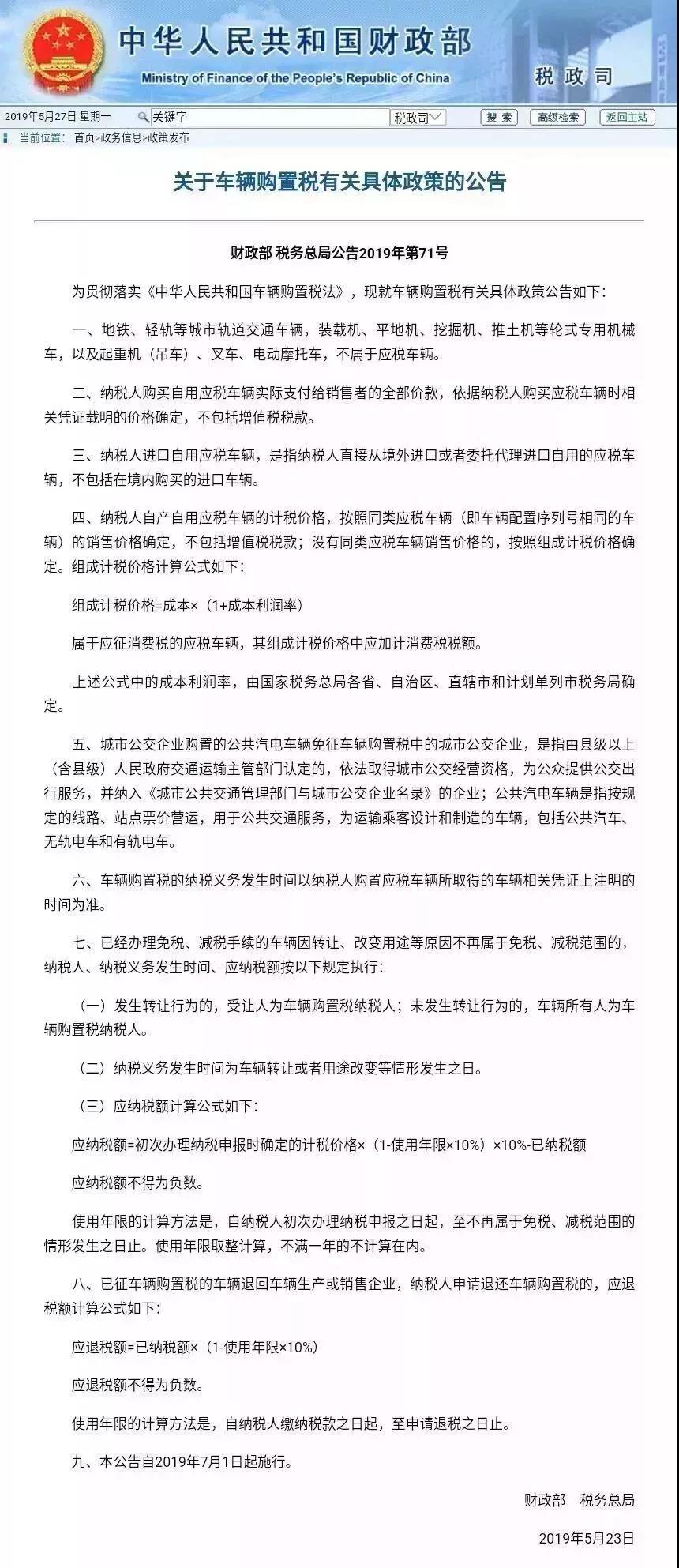 在全国范围内正式实施应用车辆购置税电子完税信息办理车辆注册登记业务,全面取消纸质车辆购置税完税证明,也就是纳税人新办车辆购置税纳税业务,税务机关不再打印、发放纸质车辆购置税完税证明。