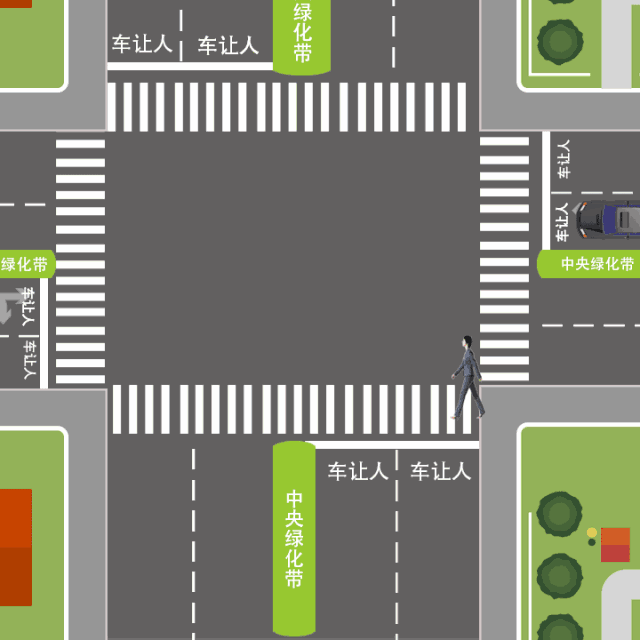 道路中央有双黄线或隔离栏,无绿化隔离带,行人步入斑马线,车辆必须让行。