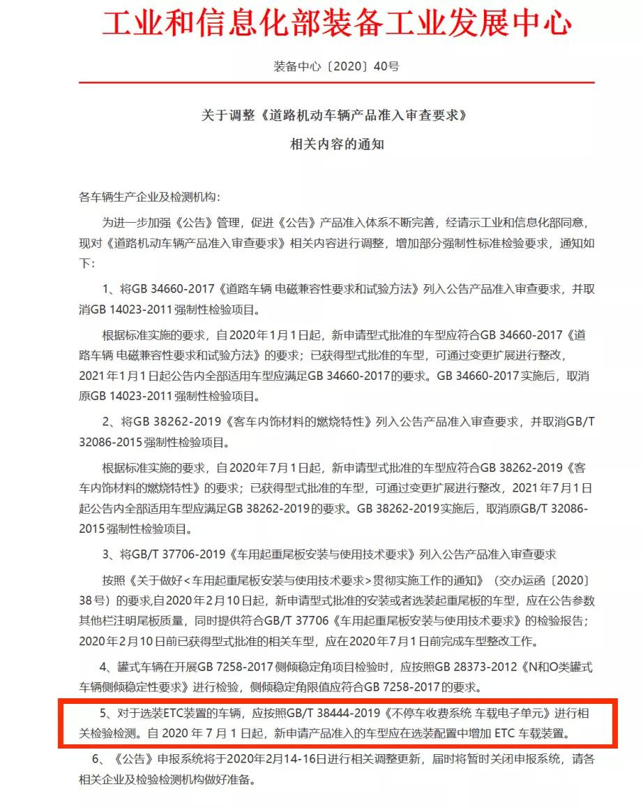 工业和信息化部装备工业发展中心发布关于调整《道路机动车辆产品准入审查要求》相关内容的通知,明确规定:对于选装ETC装置的车辆,应按照GB/T 38444-2019《不停车收费系统 车载电子单元》进行相关检验检测。自 2020 年 7 月 1 日起,新申请产品准入的车型应在选装配置中增加 ETC 车载装置。