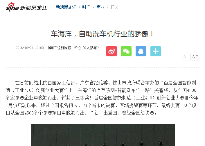 在今年结束的工业4.0创新创业大赛上,车海洋从全国4300度家参赛企业中脱颖而出,斩获了三等奖!车海洋作为唯一获奖的洗车机行业获得各界的高度关注,其中就包括了中国第一门户网站新浪新浪的高度肯定,称车海..