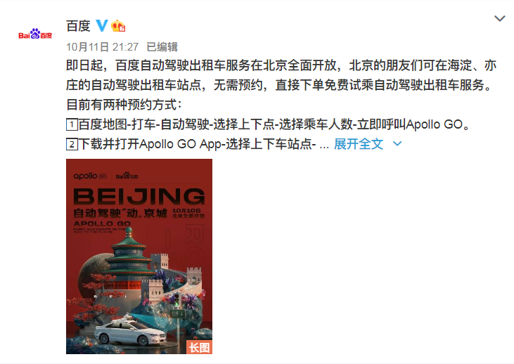 10月11日晚,百度宣布,其无人驾驶出租车服务(Robotaxi)在北京开放运营。在北京这次开放的大约700公里、覆盖了海淀、亦庄等区域的15个站点的测试区里,用户可以无需预约,直接下单试乘Apollo GO。消息一出,百度迅速火遍京城,迎来了北京热心市民的一波“打卡”试乘热浪。仅仅在10月12日一天,单站点自动驾驶出租车的约车累计就达到了2608单。