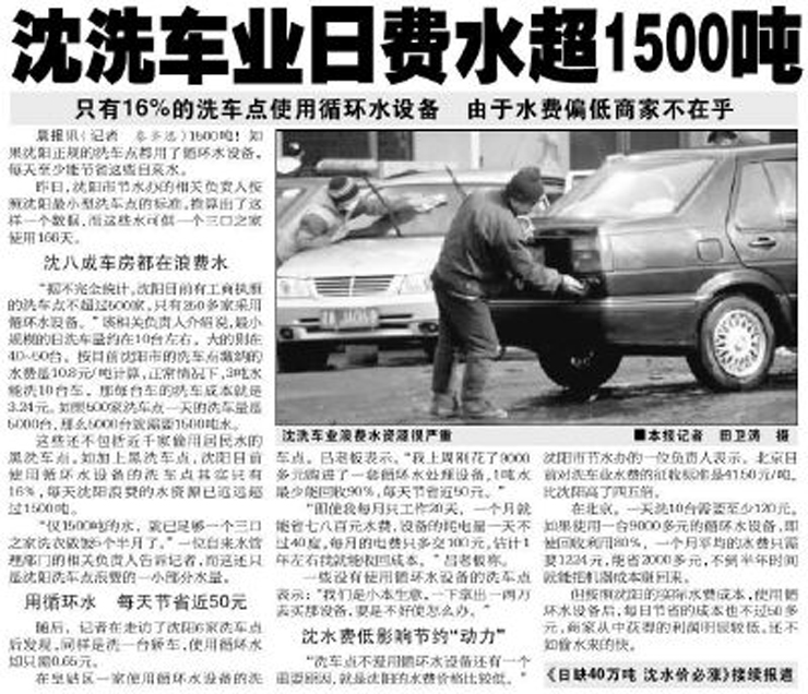 一位洗车店老板透露:一吨水大约能洗7台车,该店一天至少能洗20余台车,平均洗每台车的成本达到了8元至10元。按这个数字计算,一个小型的洗车点一个月至少用掉100吨自来水,而一个中型洗车店的月耗水量为300吨—500吨。据相关统计,按照这种洗法,全国每年仅洗车业浪费掉的自来水就超过1.5亿吨。
