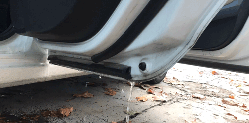当开关车门时,或者行驶中,会听到明显的水声,水在门里面晃动产生的,就是门内积水了。这时只需找个细的铁丝或细螺丝刀之类的,疏通一下排水孔即可,自己也能搞定。