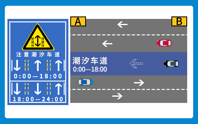 潮汐车道根据早晚交通流量不同的情况,对有条件的道路设置一个或多个车辆行驶方向规定随不同时段变化的车道,分散不同行驶方向的车流。